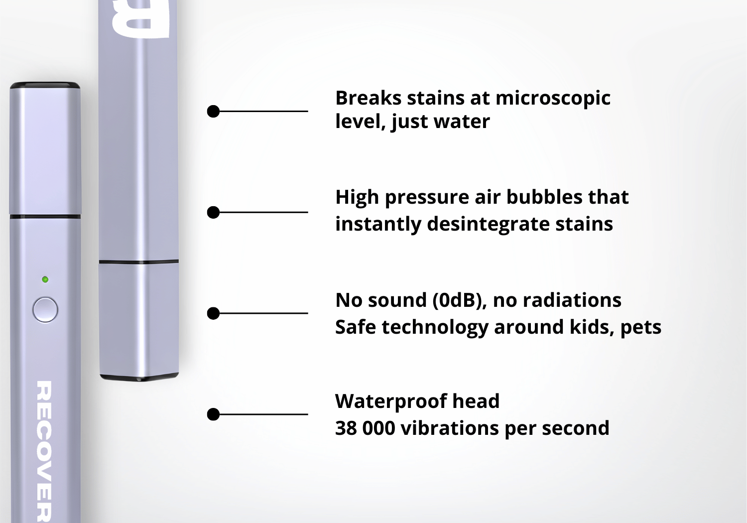 The RECOVER Ultrasonic Pen emits high-frequency vibrations that travel through water and fabric. These vibrations create microscopic high-pressure air bubbles that rapidly form and collapse directly on the stain. This process breaks stain particles at their core, without damaging the fibers.