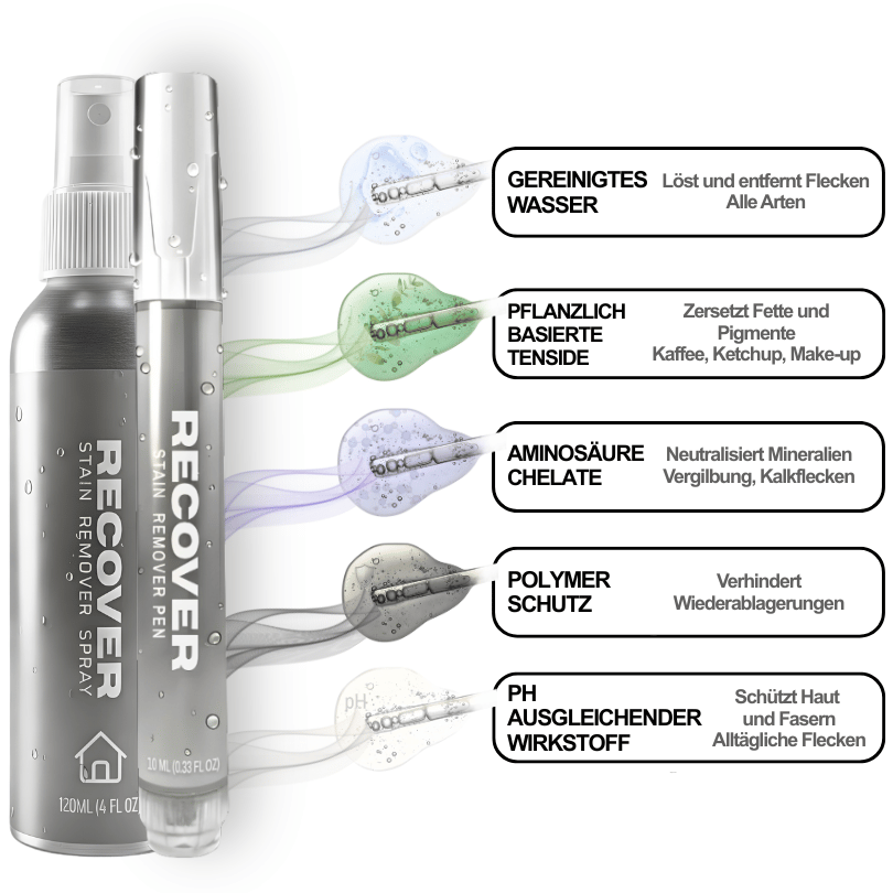 RECOVER ist ein hochwertiger Fleckenentferner , der Flecken – Kaffee, Wein, Make-up, Soße, Schlamm – auf Kleidung, Schuhen und Stoffen sofort entfernt , ohne die Fasern zu beschädigen oder die Farben verblassen zu lassen.