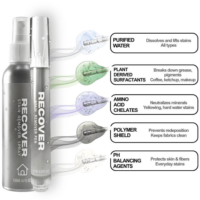 RECOVER is a high-end stain remover designed to instantly eliminate stains — coffee, wine, makeup, sauce, mud — on clothes, shoes, and fabrics, without damaging fibers or fading colors.